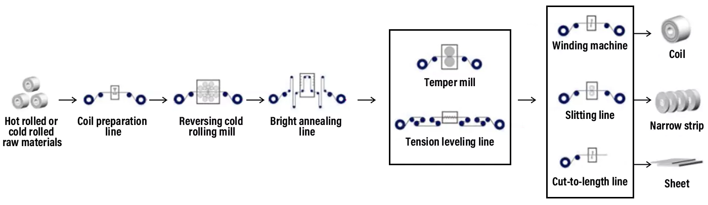 In this process flow, the hot-rolled or cold-rolled stainless steel raw materials are rolled to the target thickness by a high-precision reversible multi-high cold rolling mill at ambient temperature, and the bright heat treatment is carried out to have the surface effect and mechanical properties required by customers, and then the process of tempering or tension leveling is carried out to optimize the surface and shape of the stainless steel sheet and strip, and the products’ mechanical properties are enhanced to the level that meets the requirement by the precision cold-rolled stainless steel sheet and strip; the precision cold-rolled stainless steel sheet and strip produced through this process is soft in terms of mechanical properties.